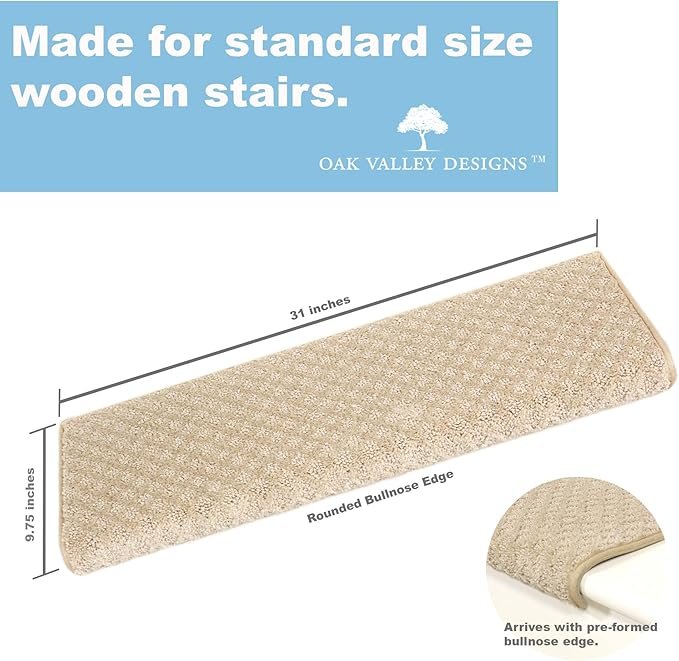 Enhance the safety and elegance of your wooden stairs with Oak Valley Designs™ Rounded Bullnose Carpet Stair Treads. Crafted from premium materials, these treads feature a peel-and-stick design for easy installation—no nails or staples required. The non-slip fibers provide excellent traction, while the rounded bullnose front ensures a perfect fit on wooden steps. Available in various styles and sizes, these treads offer a luxurious feel and timeless style to complement any home decor.